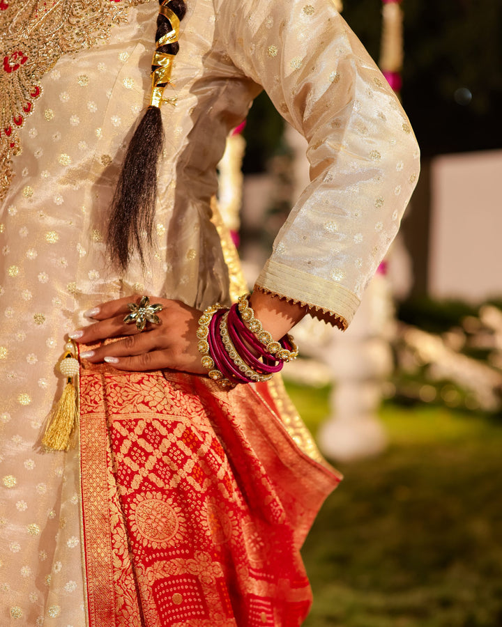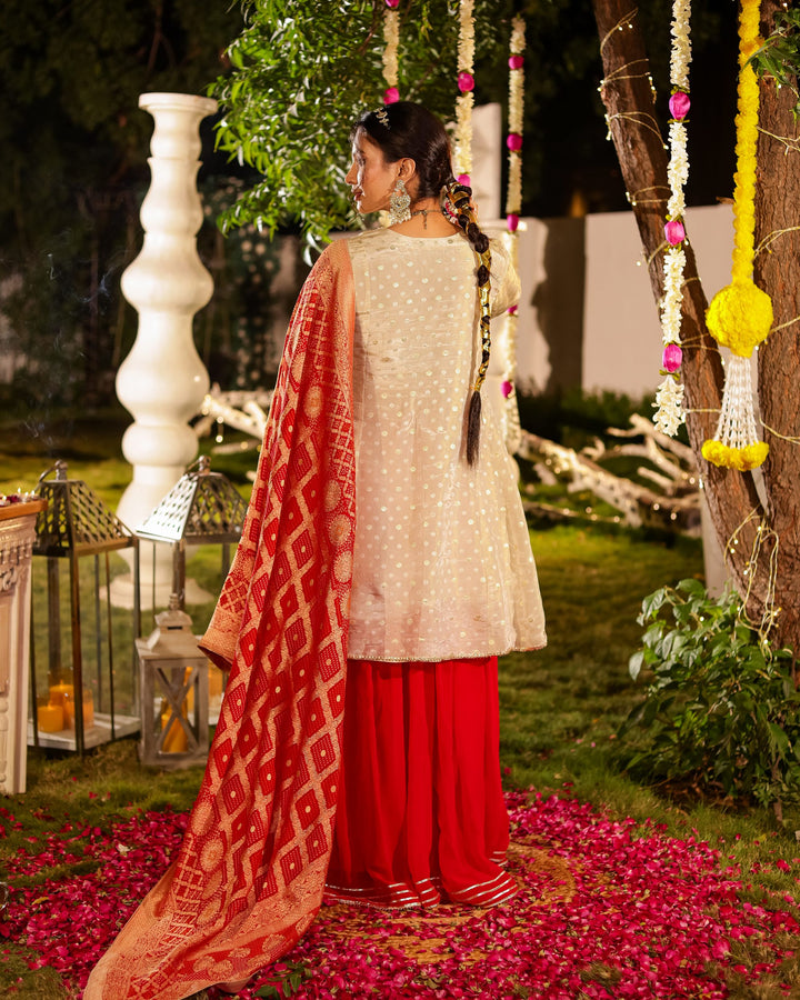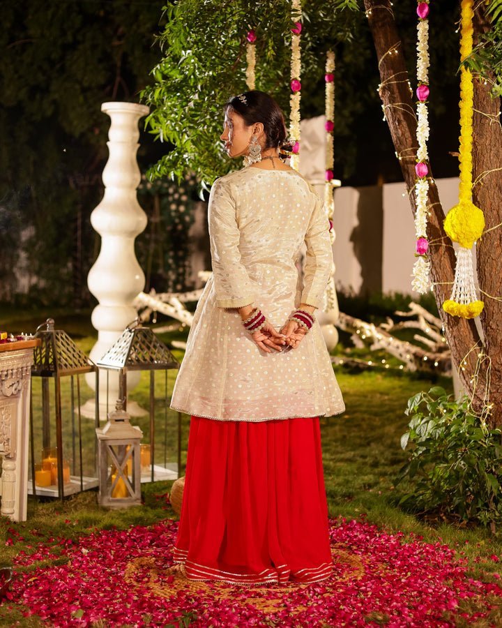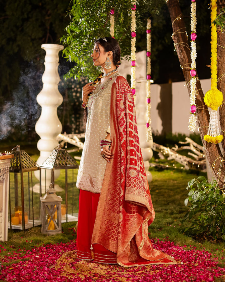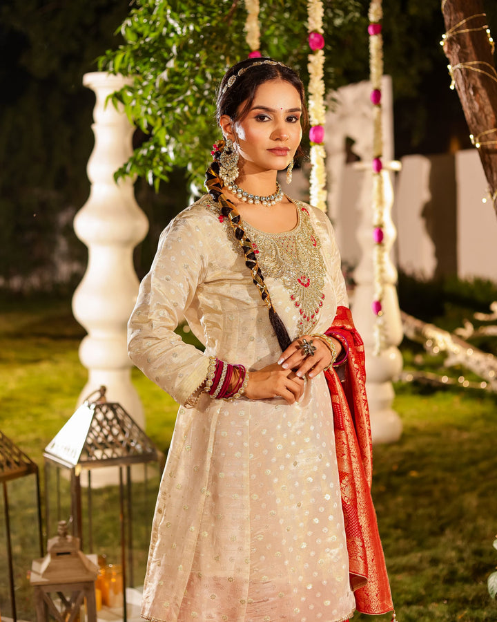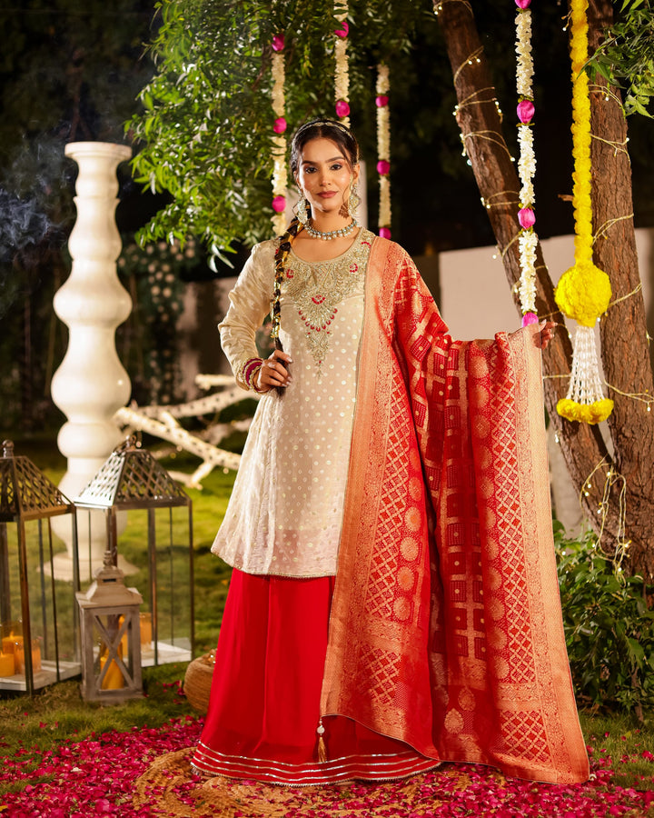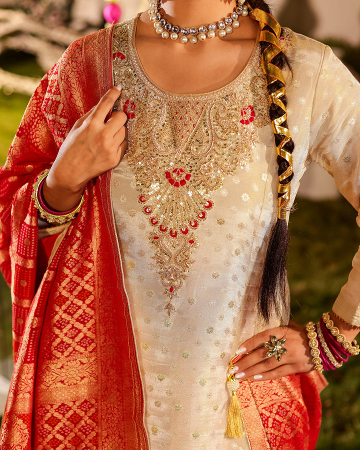 Radiate timeless grace with this Cream Kurta With Skirt, designed to elevate your festive and traditional look. The kurta features exquisite Zardozi hand embroidery, adding a royal and sophisticated touch to...