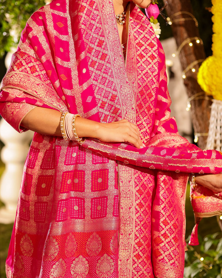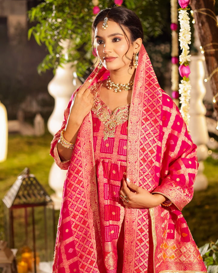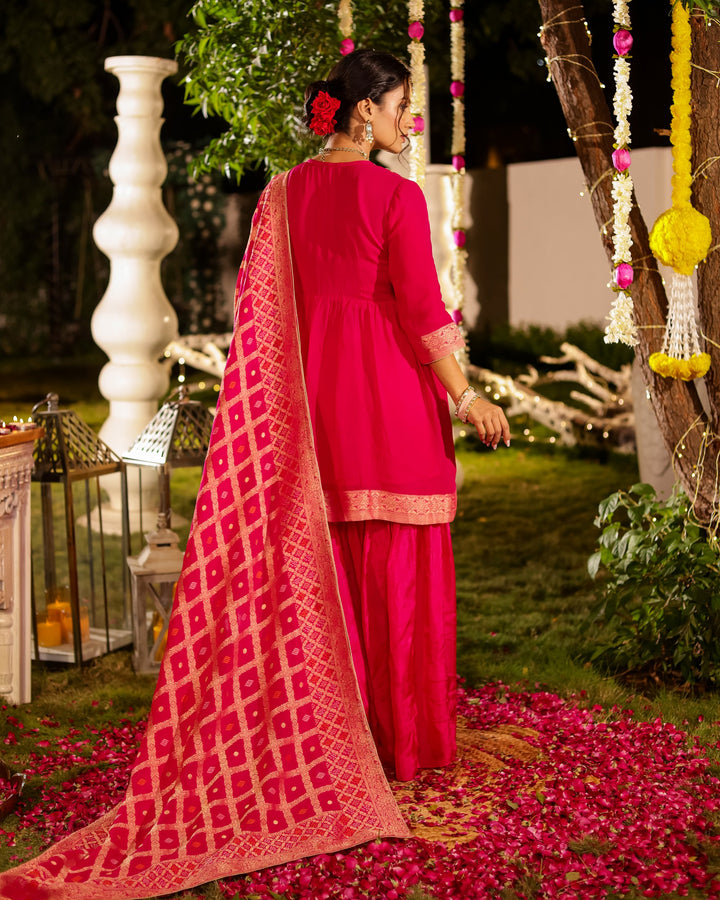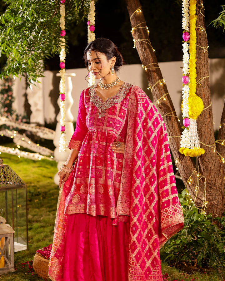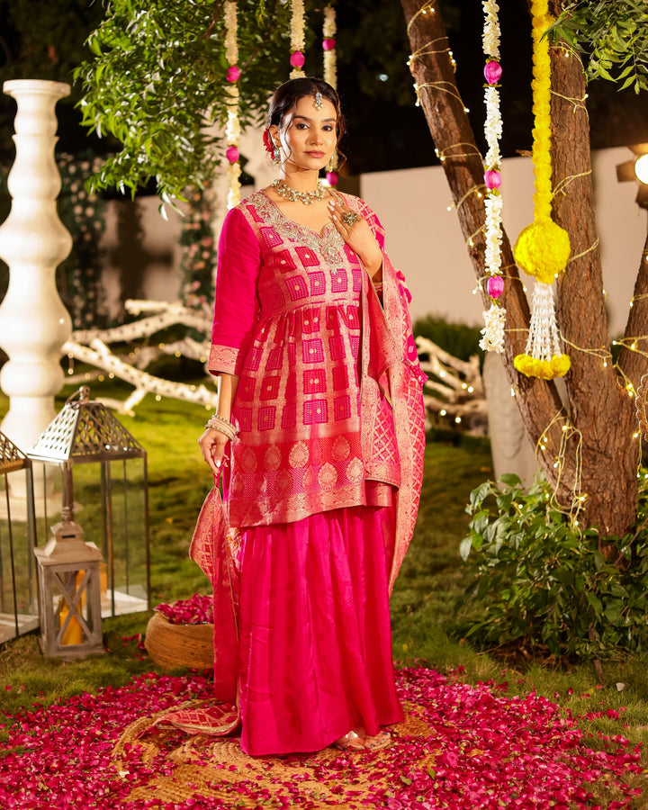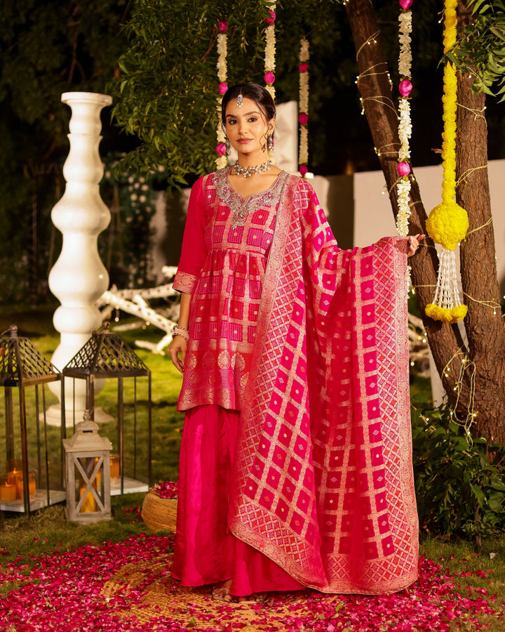 Turn heads with this exquisite Pink Ghatchola Sharara Set, a perfect blend of tradition and grace. The georgette kurta is beautifully embellished with fine Zardozi hand embroidery, adding a royal touch...